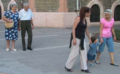 Kecskemet - A 4 day trip with Tibor's aunt and uncle to visit family in Kecskemet. Lulu was the star of the show and had everyone running around after her - what a sweetie. (Photo: Tibor's aunt and uncle holding hands watching Tania and Andy swinging Zoe along)