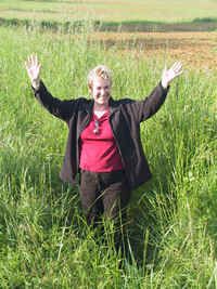 France - Just outside of Gemil, South France - Jan demonstrates how she was pushed off her bike into the ditch by Des leaving her with a fractured rib and a "bit of a headache"!